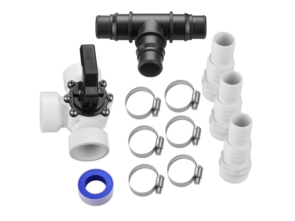 So sadou od značky monzana® môžete cielene regulovať prietok vody pomocou 3-cestného ventilu. To je výhodné najmä pri použití solárnych systémov alebo tepelných čerpadiel na riadenie a optimalizáciu vykurovacieho výkonu. Kompletná sada obsahuje 3-cestný ventil s uzatváracím kohútikom, vhodné hadicové objímky vrátane 6 hadicových svoriek, teflónovú pásku (8,0 m), 3 x ABS adaptér a 1 x T-kus. Pre tri ABS adaptéry môžete použiť bazénové hadice od 1,25" (Ø 32 mm) do 1,5" (Ø 38 mm). S 3-cestným ventilom môžete pripojiť bazénové hadice 1,5" (Ø 38 mm).