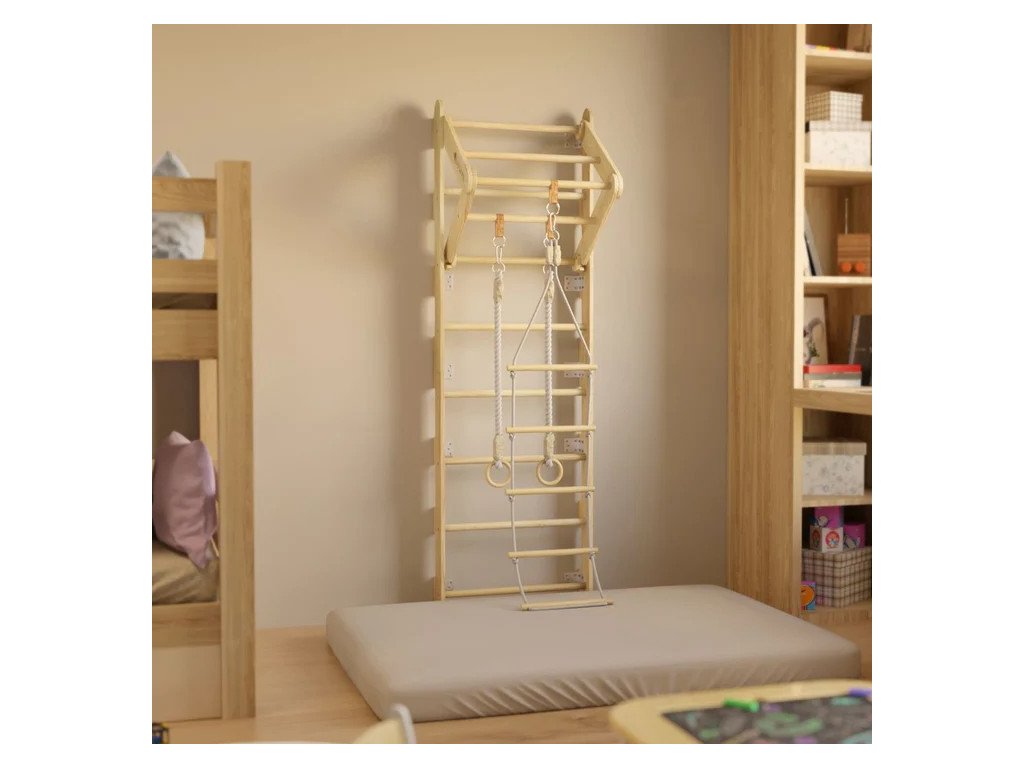 Z obyčajnej izby sa stane miesto plné športových výziev a radosti. Deti môžu liezť, šplhať alebo sa hojdavo hrať. Pre malých dobrodruhov je to ideálny spôsob, ako si precvičiť telo a získať nové zručnosti. Stabilná drevená konštrukcia ponúka pevnosť a bezpečie, zatiaľ čo prírodný vzhľad dokonale zapadne do každej izby. Na spodok odporúčame pridať matrac alebo podložku, aby bol priestor ešte bezpečnejší. Gymnastické kruhy aj odnímateľný lanový rebrík prinášajú ďalšie možnosti hry a zároveň podporujú rozvoj rovnováhy, koordinácie a sily.Technické špecifikácie: