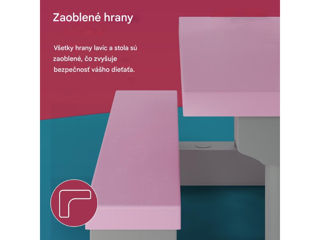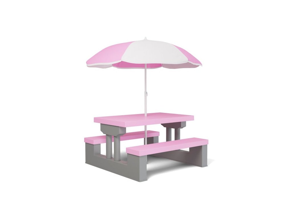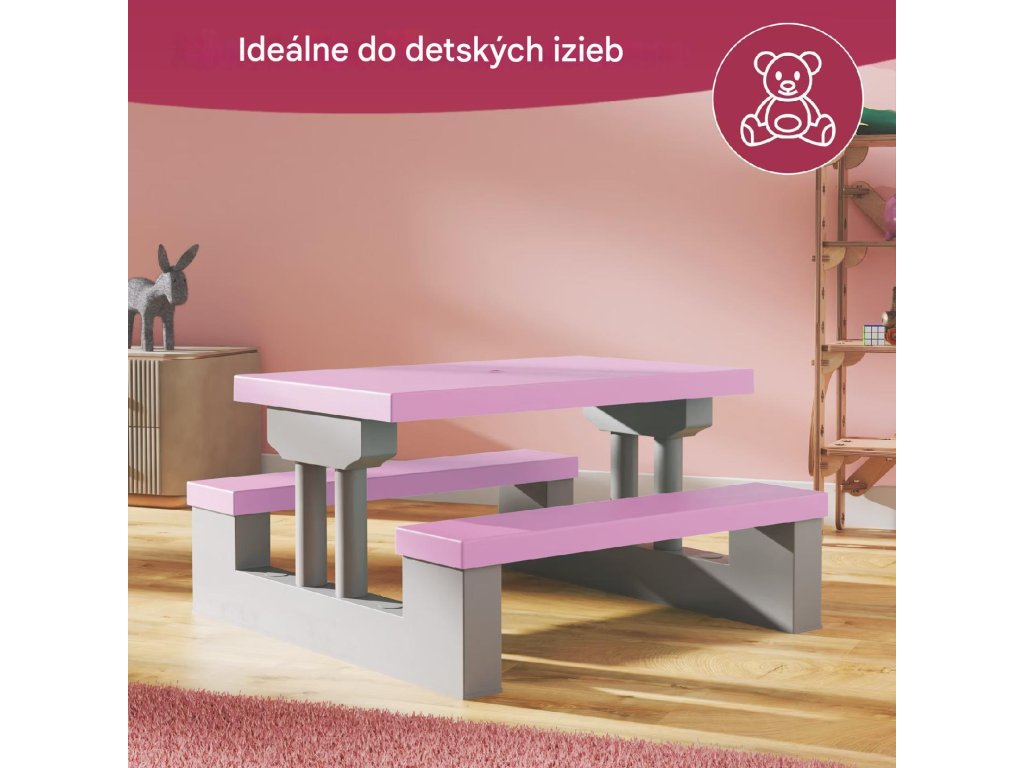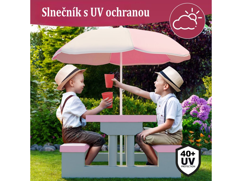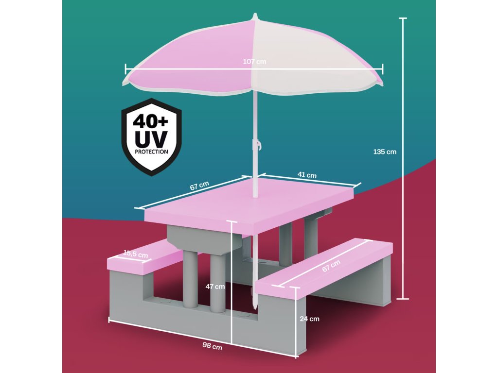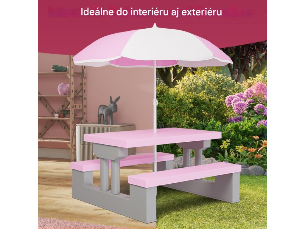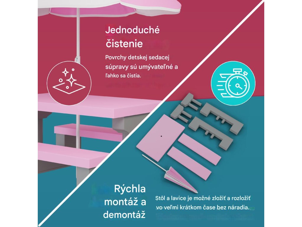 Detský set do interiéru aj exteriéru pozostáva zo stola s dvoma pevne spojenými lavicami a veľkého slnečníka zo 100% polyesteru. To zaisťuje aj primeranú ochranu pred slnkom pri hre na záhrade alebo terase. Vďaka jednoduchej montáži a demontáži je možné set kedykoľvek ľahko prepravovať. Dizajn vhodný pre deti je viditeľný nielen na pohľad, ale aj na konštrukcii. Kompletný detský set je vyrobený z robustného materiálu s príjemným povrchom. Všetky hrany lavíc a stola sú zaoblené, čo zvyšuje bezpečnosť pre vaše dieťa.
