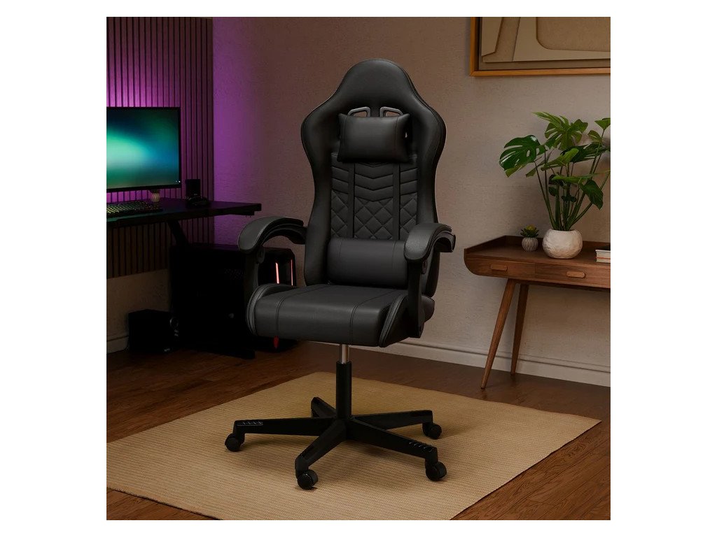 Táto kancelárska stolička ponúka ergonomické pohodlie, nastaviteľné operadlo s vankúšom na krk a chrbát a robustnú konštrukciu. Je výškovo nastaviteľná a má nosnosť až 120 kg. Povrch stoličky je potiahnutý ľahko udržiavateľnou umelou kožou, takže je ideálna do kancelárie alebo na hranie hier. Vďaka individuálne nastaviteľnému operadlu a optimálnej výške sedadla si stoličku nastavíte tak, aby ste si zabezpečili pohodlie a komfort pri dlhšom sedení. Nylonová základňa a vysoko kvalitné materiály poskytujú bezpečnú oporu aj pre väčších a ťažších používateľov. Na čistenie použite mäkkú, vlhkú handričku no nepoužívajte agresívne ani abrazívne čistiace prostriedky.Technické špecifikácie: