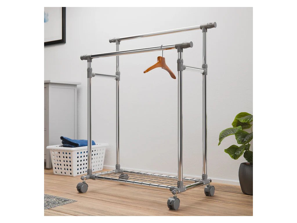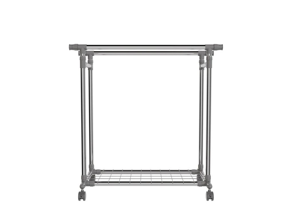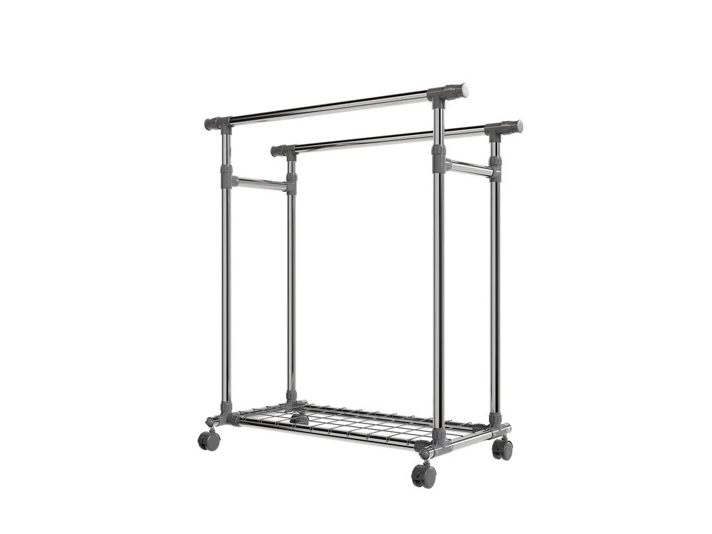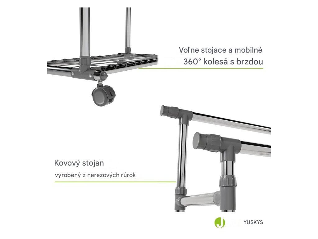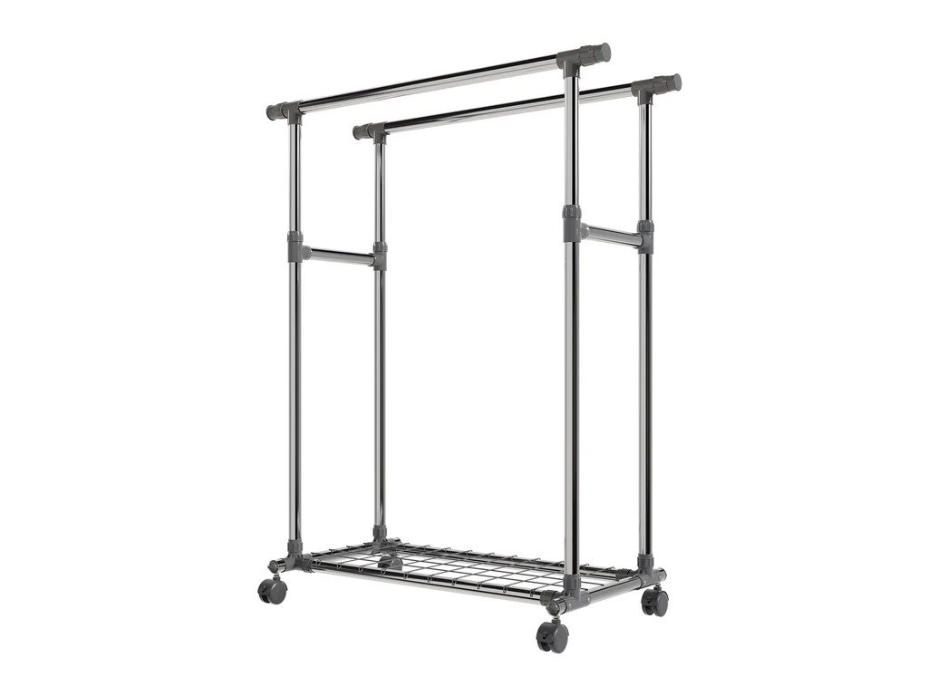 Pojazdný stojan na oblečenie s kolieskami, dvoma tyčami a praktickou policou je skvelým riešením na prehľadné uloženie oblečenia, topánok a tašiek. Poskytuje priestor na zavesenie búnd, kabátov či košieľ, zatiaľ čo polica poslúži na uskladnenie doplnkov a ľahších predmetov. Stojan má nastaviteľnú výšku tyčí, vďaka čomu naň pohodlne zavesíte aj dlhé šaty alebo kabáty. Bočné výsuvné ramená ponúkajú dodatočný priestor na oblečenie. Kolieska s 360° rotáciou umožňujú jednoduché premiestňovanie, pričom dve z nich sú vybavené brzdami na zaistenie stability. Konštrukcia z pevnej ocele zaručuje pevnosť a odolnosť. Každá tyč unesie až 17 kg, zatiaľ čo polica má nosnosť 3 kg.Technické špecifikácie: