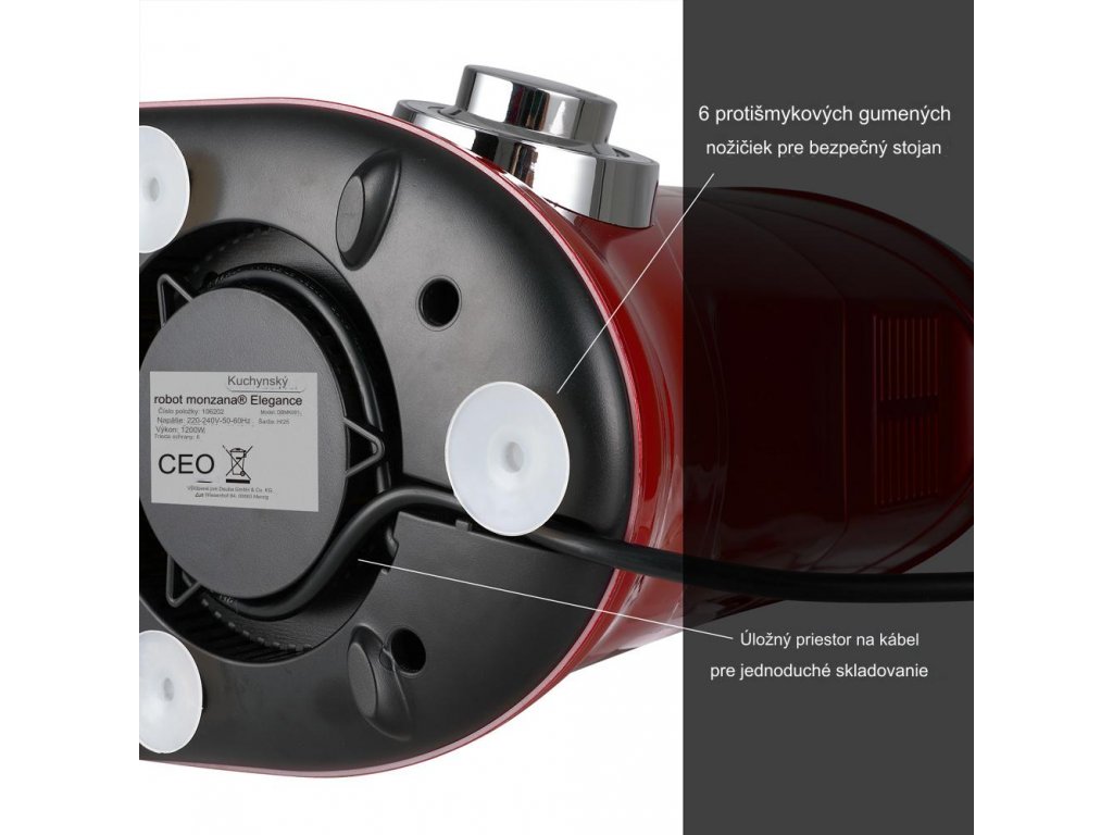 Priehľadné veko proti striekajúcej vode s plniacim otvorom zaisťuje čistú prácu a umožňuje jednoduché pridávanie prísad počas prevádzky. Rýchloupínací systém umožňuje rýchlu a jednoduchú výmenu rôznych nadstavcov. 6 protišmykových gumených nožičiek poskytuje bezpečné státie pri práci. Lesklý kryt a LED osvetlenie regulátora rýchlosti robia z kuchynského spotrebiča skutočný pútač vo vašej kuchyni.