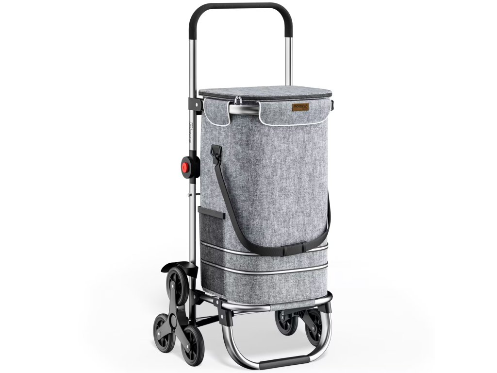 Nákupný vozík ponúka veľa úložného priestoru, Použite vozík ako nákupnú pomôcku, praktickú tašku cez rameno ako malý ručný vozík. Pomocou integrovaných háčikov sa dá jednoducho pripevniť k nákupnému košíku. Odnímateľná taška je vyrobená z hustej a robustnej tkaniny Oxford 600D. Veľká vnútorná chladiaca taška ponúka optimálnu ochranu pred slnečným žiarením pre chladené produkty. Vozík má dve bočné vrecká a malé zadné vrecko na zips.