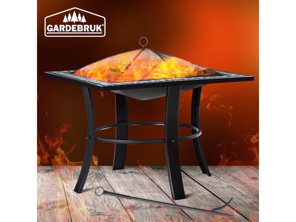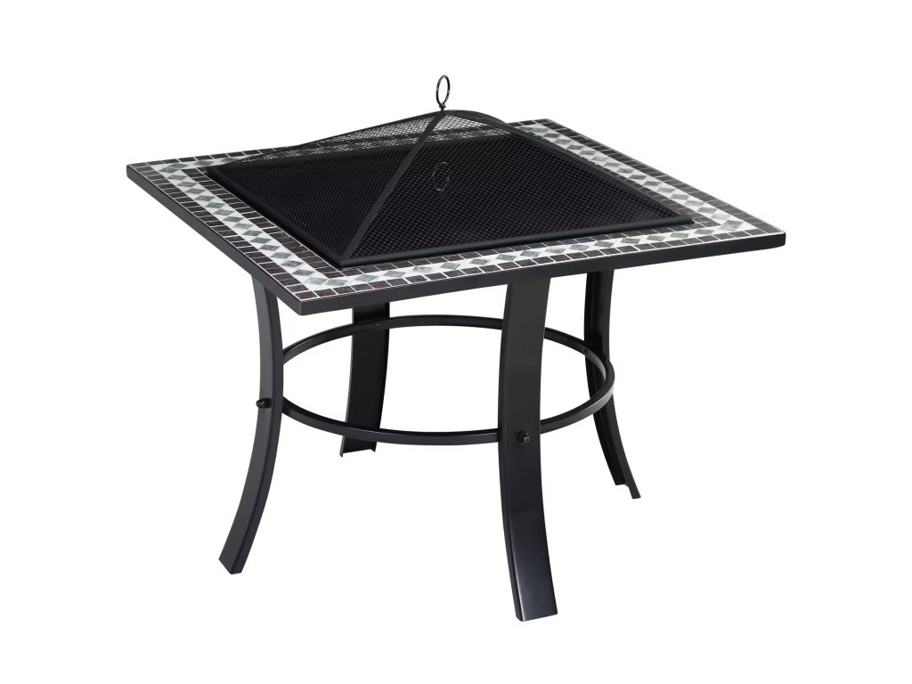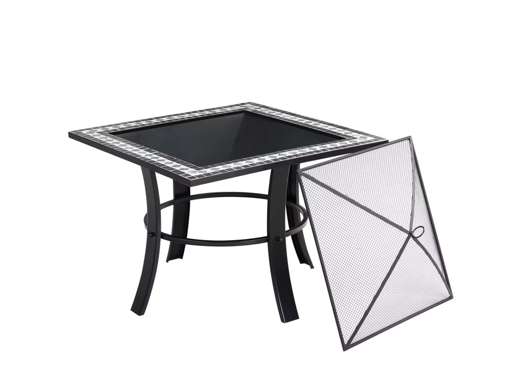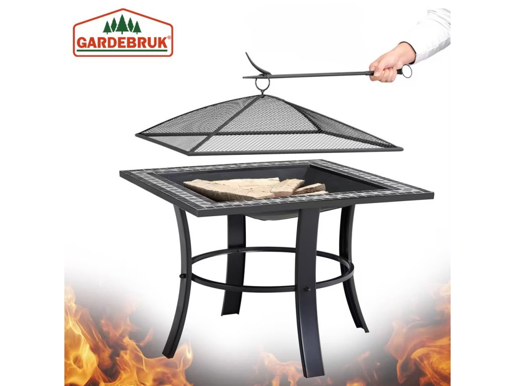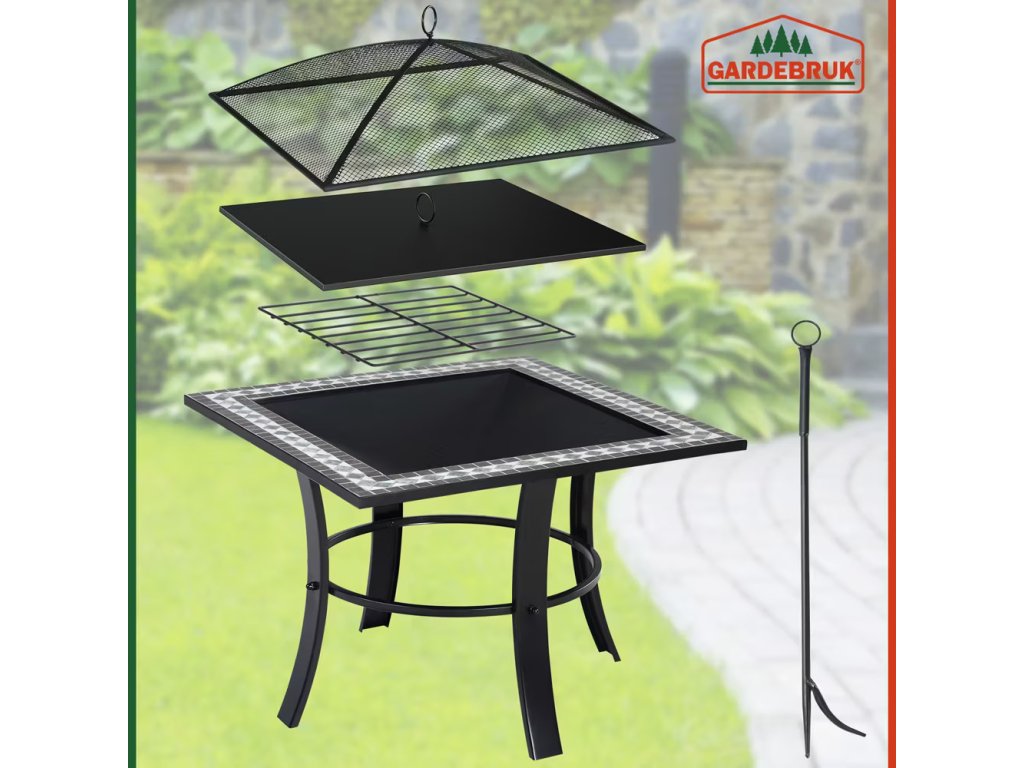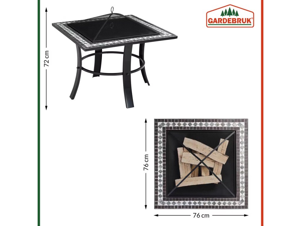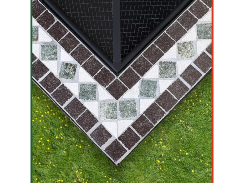 Exkluzívne štvorcové ohnisko má rám vyrobený z práškovo lakovanej ocele a je zdobené mozaikovými kamienkami, ktoré zaistia extravagantnú atmosféru vo Vašej záhrade alebo na terase. Ohnisko má praktický kryt, ktorý slúži ako ochrana pred dažďom, lístím a proti nežiaducemu lietajúcemu popolu. Vďaka krytu môže ohnisko dokonale poslúžiť aj ako odkladací stolík.