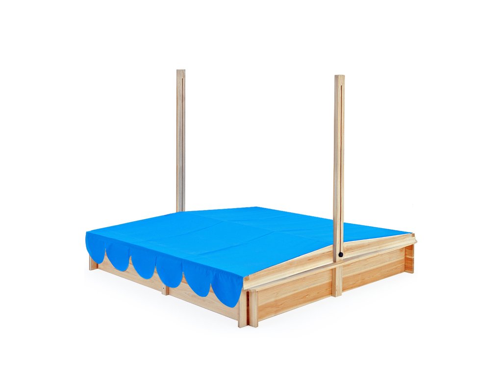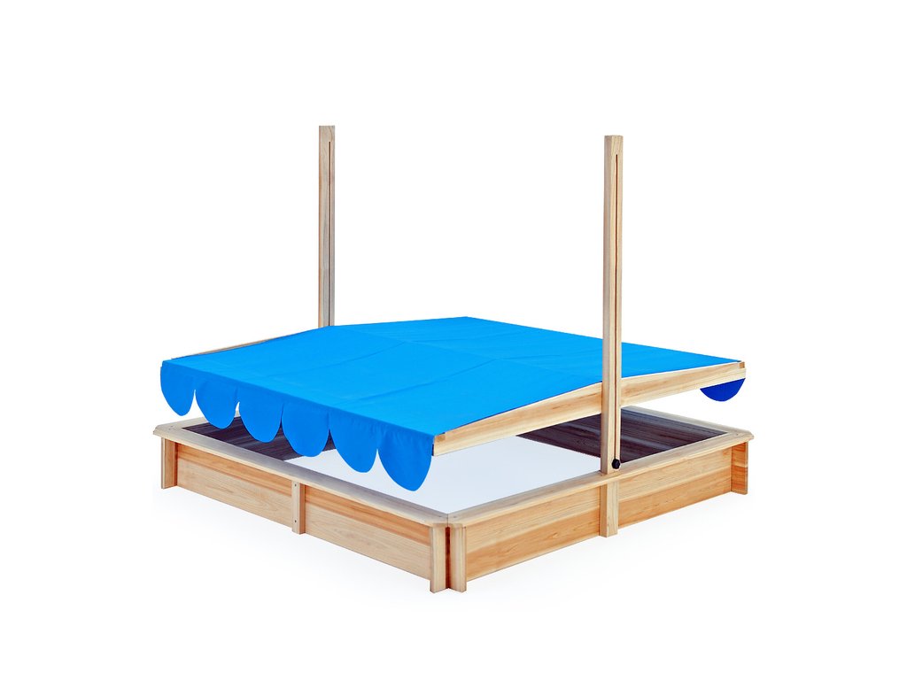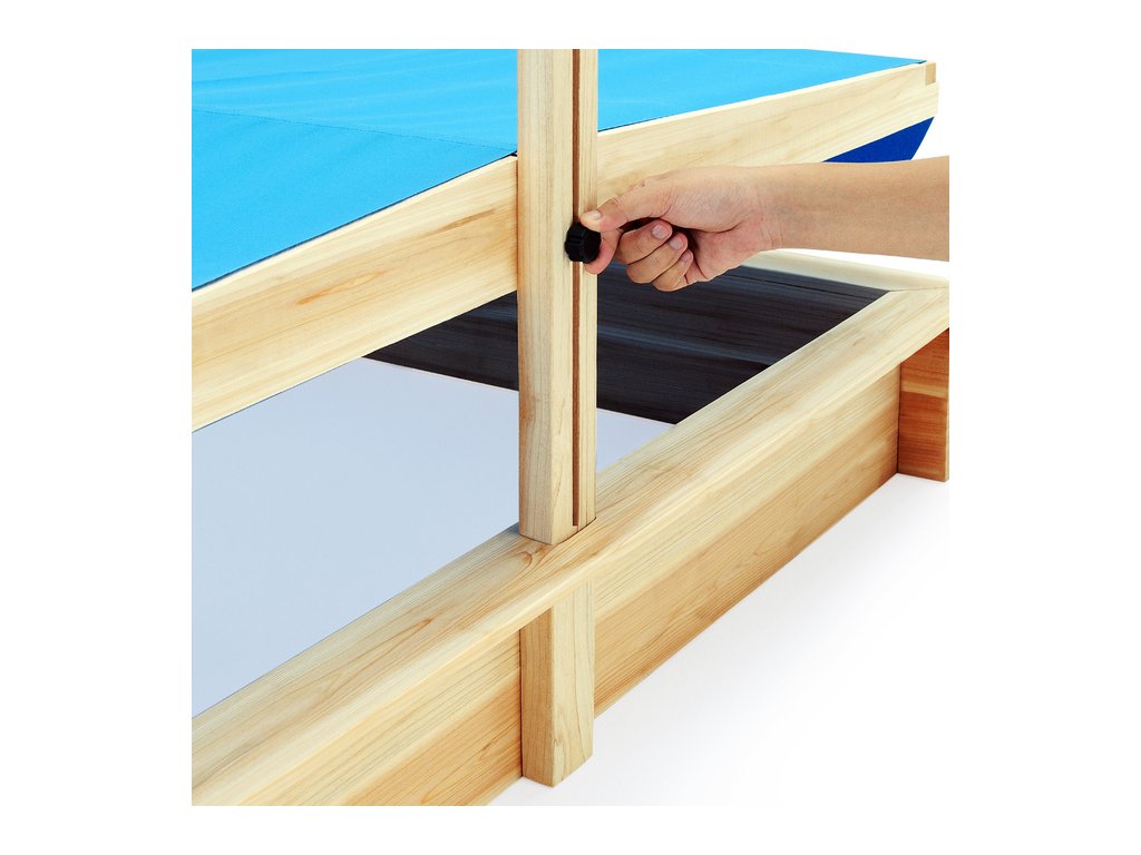 Pieskovisko je vyrobené z prírodného masívneho dreva. Má výškovo nastaviteľnú a otočnú striešku a chráni vaše dieťa pred slnkom alebo vlhkosťou. Pieskovisko sa jednoducho a rýchlo montuje. Striešku môžete použiť ako kryt, takže je piesok chránený pred nečistotami keď sa nepoužíva.