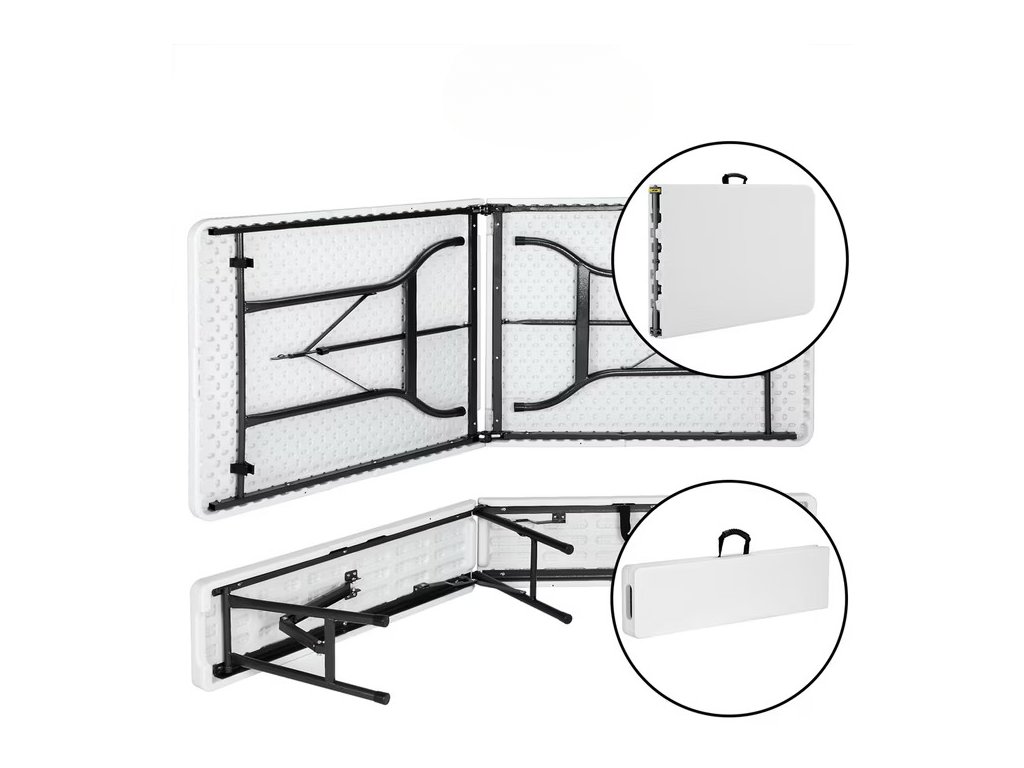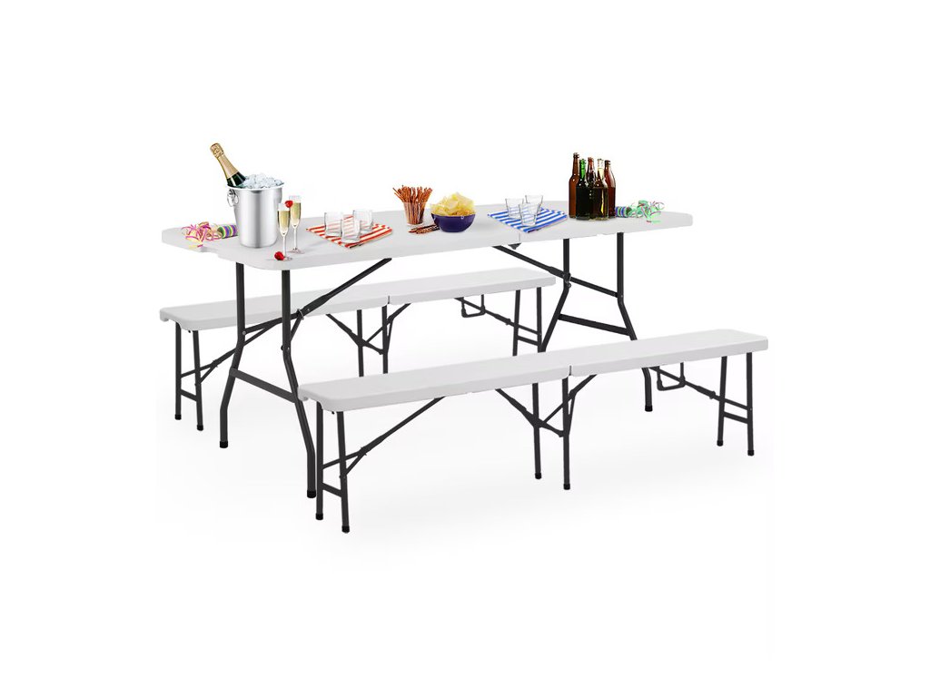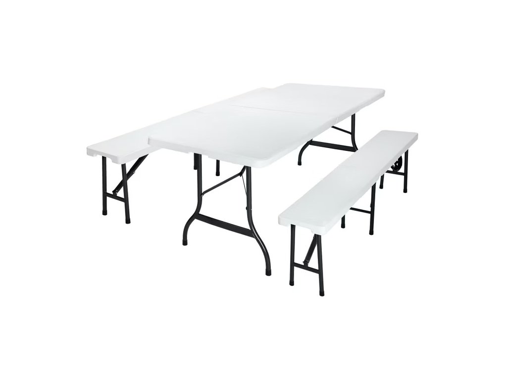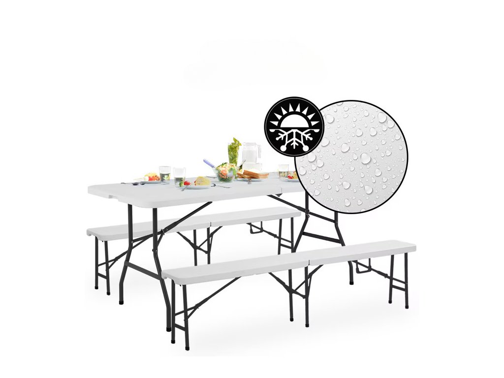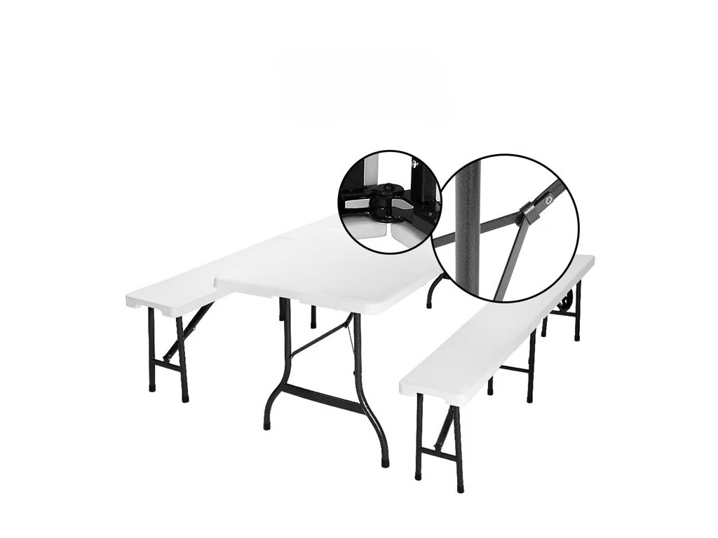 Praktický pivný set z odolného plastu ponúka pohodlné posedenie s minimálnou údržbou. Vďaka skladaciemu dizajnu ho rýchlo rozložíte a využijete aj v obmedzenom priestore. Stôl aj lavice sú vybavené praktickou výklopnou funkciou, vďaka ktorej ich možno jednoducho zložiť na kompaktných 91,5 cm a úsporne uskladniť do ďalšieho použitia. Bočné madlá, nízka hmotnosť a kufrový mechanizmus umožňujú jednoduché prenášanie a pohodlné uloženie do kufra auta. Pre bezpečné používanie v interiéri sú nohy stola a lavíc vybavené ochrannými prvkami, ktoré zabraňujú poškriabaniu citlivých podláh.