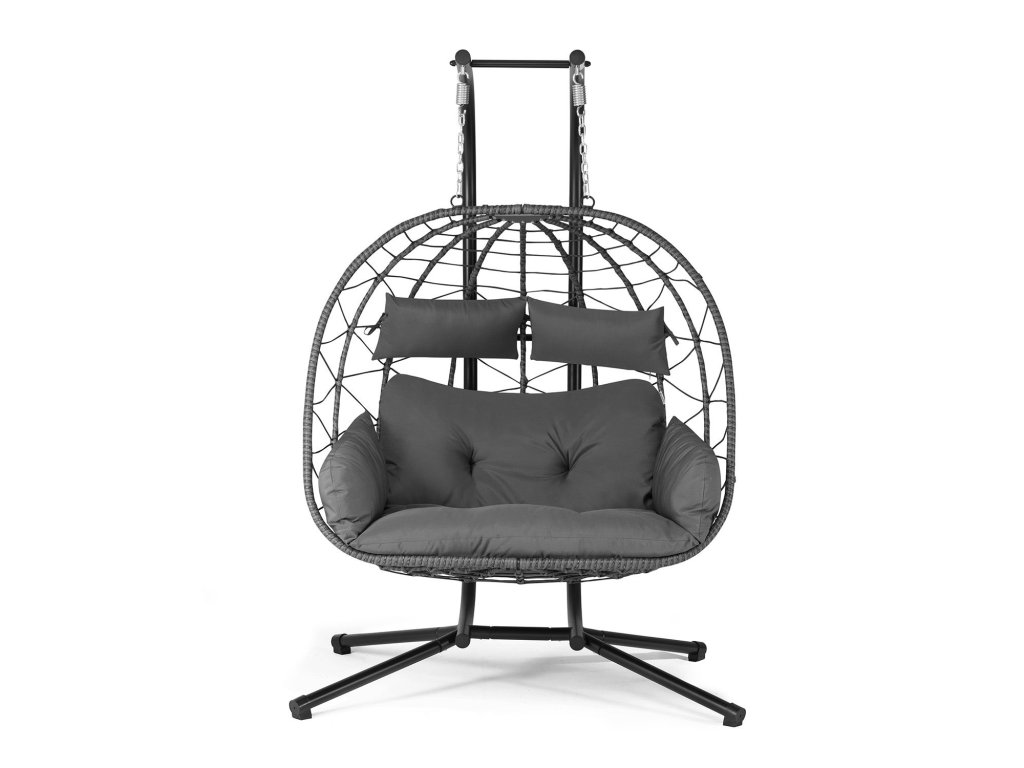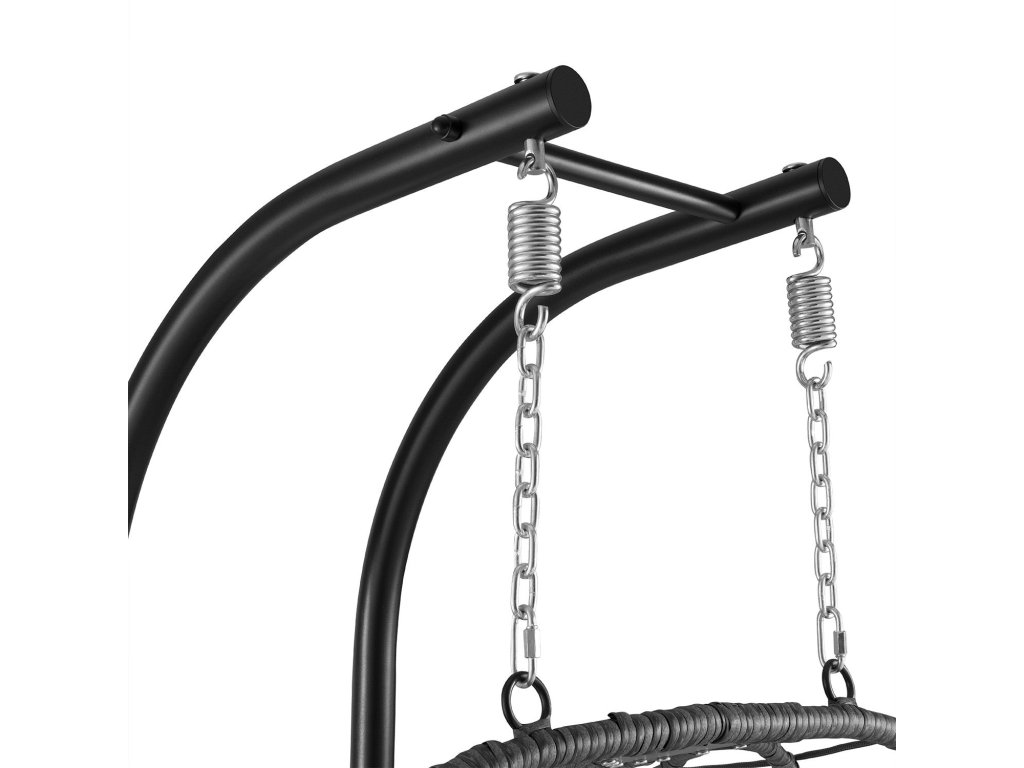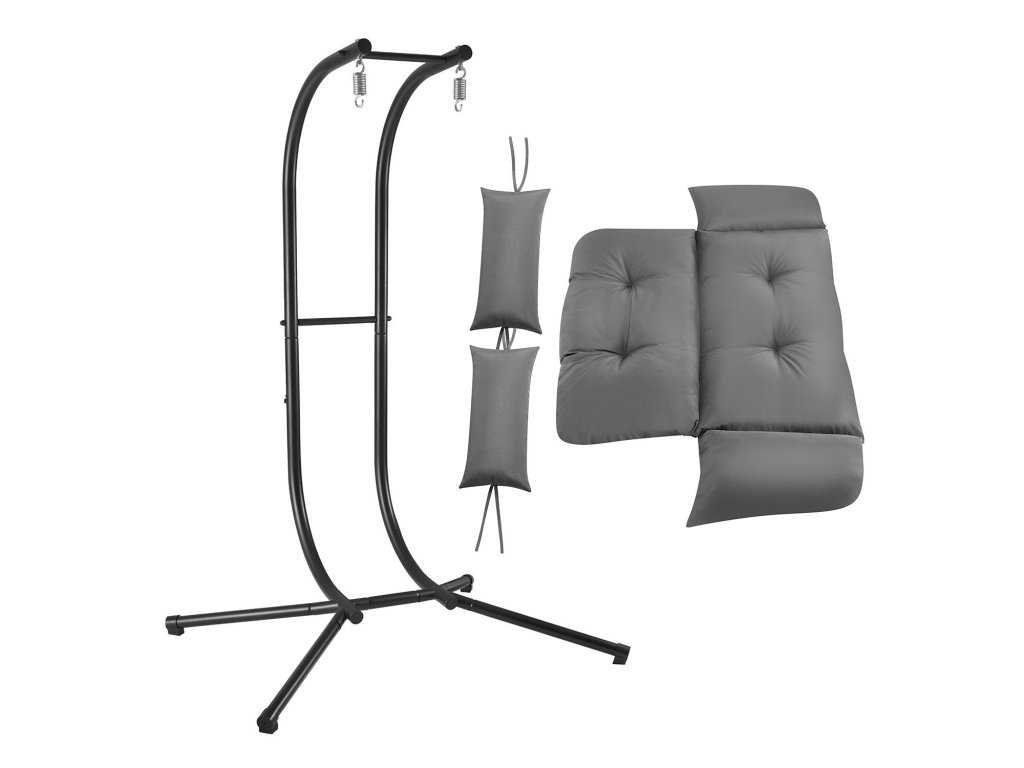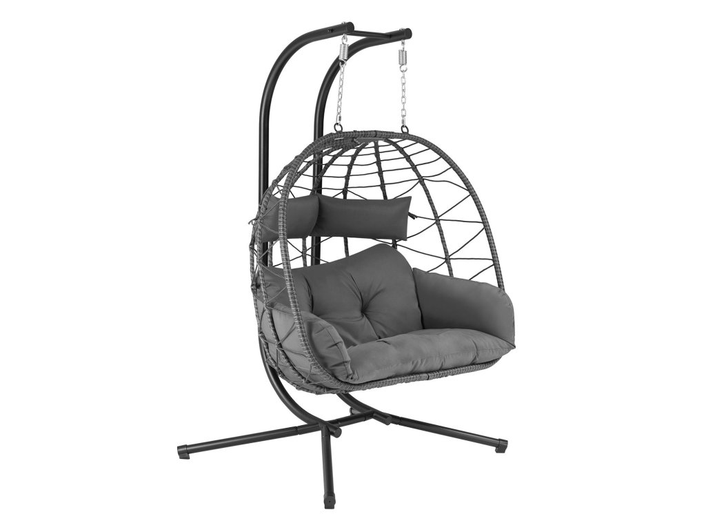 Štýlové závesné dvojkreslo Aria v elegantnej tmavošedej farbe kombinuje pohodlie hojdania so sofistikovaným dizajnom. Vychutnajte si hojdanie vo veľkom závesnom dvojkresle s mäkkými vankúšmi, ktoré zaručujú maximálne pohodlie. Toto voľne stojace dvojkreslo, vybavené pružinovým odpružením a pevným železným rámom, je schopné uniesť až 220 kg a jeho výšku si môžete prispôsobiť podľa potreby. Krásne dvojkreslo môžete umiestniť do interiéru alebo do vonkajšieho priestoru chráneného pred poveternostnými vplyvmi. Skrášli každý byt, záhradu či terasu. Pre úsporu miesta je možné dvojkreslo jednoducho zložiť. Súčasťou dodávky je bezpečnostný popruh, ktorým môžete košík pripevniť k zadnej časti rámu, aby sa kreslo príliš nekývalo.
