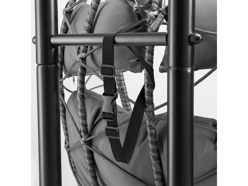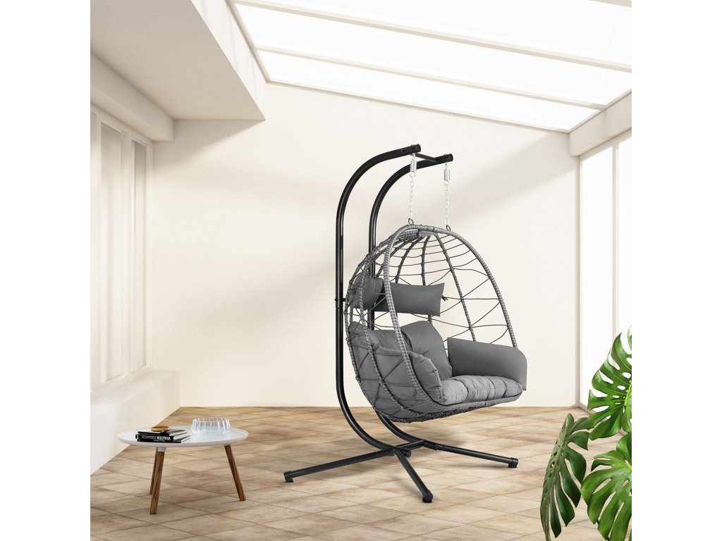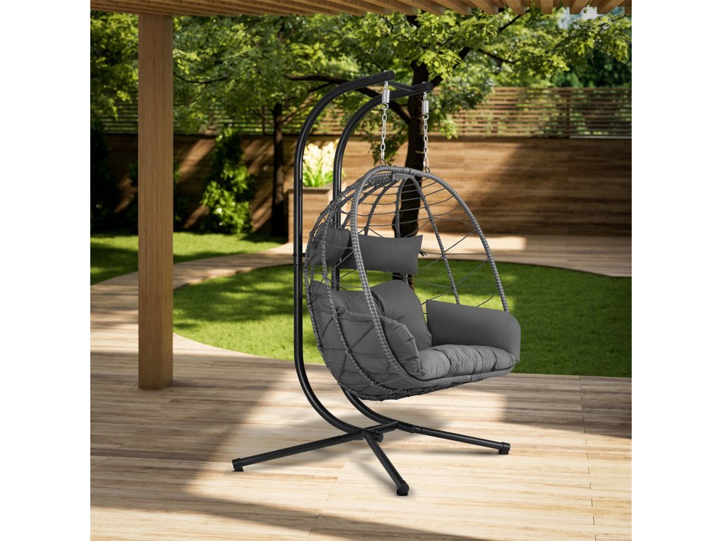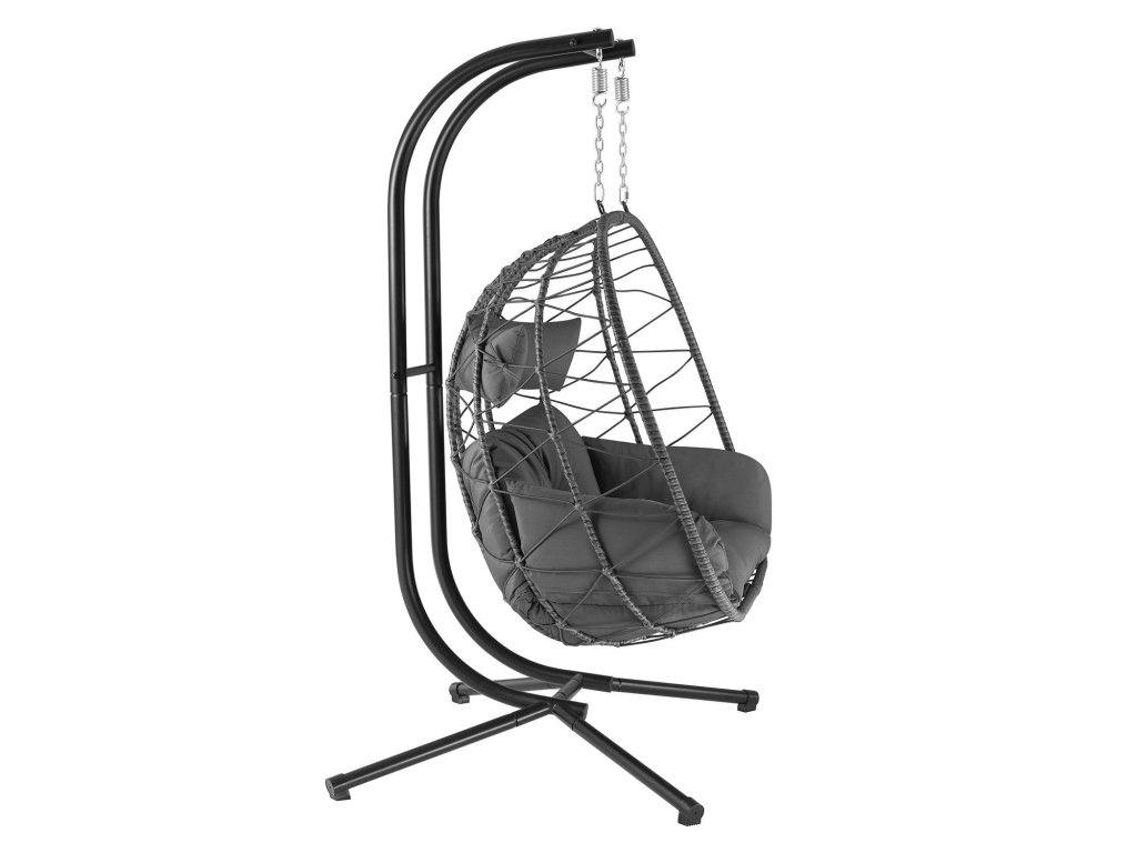 Štýlové závesné dvojkreslo Aria v elegantnej tmavošedej farbe kombinuje pohodlie hojdania so sofistikovaným dizajnom. Vychutnajte si hojdanie vo veľkom závesnom dvojkresle s mäkkými vankúšmi, ktoré zaručujú maximálne pohodlie. Toto voľne stojace dvojkreslo, vybavené pružinovým odpružením a pevným železným rámom, je schopné uniesť až 220 kg a jeho výšku si môžete prispôsobiť podľa potreby. Krásne dvojkreslo môžete umiestniť do interiéru alebo do vonkajšieho priestoru chráneného pred poveternostnými vplyvmi. Skrášli každý byt, záhradu či terasu. Pre úsporu miesta je možné dvojkreslo jednoducho zložiť. Súčasťou dodávky je bezpečnostný popruh, ktorým môžete košík pripevniť k zadnej časti rámu, aby sa kreslo príliš nekývalo.