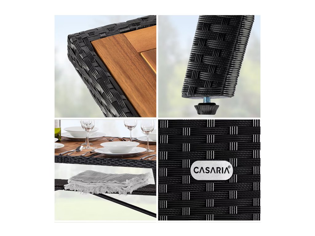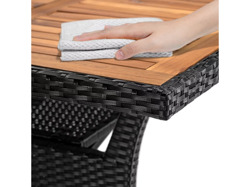 Tento elegantný polyratanový záhradný stôl je vybavený robustnou stolovou doskou z olejovaného agátového dreva a prírodná, elegantná kresba dreva sú vrcholom každej záhradnej párty. Jeho štýlový a praktický dizajn zaručuje odolnosť voči vetru a nepriaznivému počasiu, čo ho predurčuje ako ideálny doplnok do vašej záhrady či na terasu. Polyratan bol špeciálne vytvorený pre záhradný nábytok, čím vyniká svojou odolnosťou voči UV žiareniu, odpudzuje nečistoty a veľmi ľahko sa čistí. Rám stola je konštruovaný z pevnej ocele s práškovým nástrekom, ktorá mu dodáva silu a odolnosť voči veľkému zaťaženiu. Navyše, jednotlivé nohy stola sú výškovo nastaviteľné, čo umožňuje jeho stabilné umiestnenie aj na nerovných povrchoch. Pre zachovanie pôvodnej farby sa odporúča v pravidelných intervaloch ošetrovať tvrdé drevo výživným olejom na drevo.Výhody produktu: