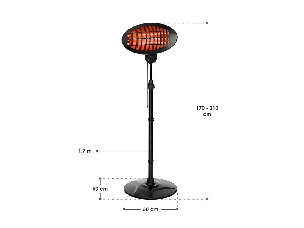 Výškovo nastaviteľný teleskopický stojan umožňuje prispôsobiť výšku ohrievača v rozmedzí od 170 do 210 cm. Stabilná oceľová základňa a pevná konštrukcia zaručujú bezpečné používanie v exteriéri aj interiéri. Naklopenie hlavy ohrievača do uhla 45° umožňuje lepšie zacielenie tepla.