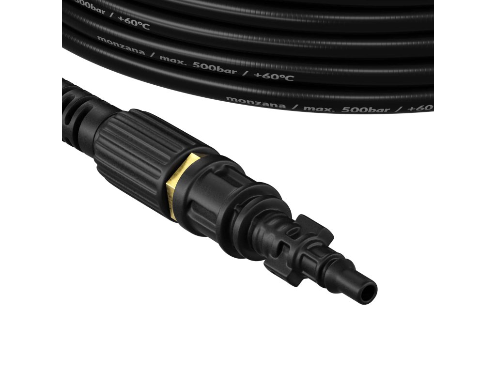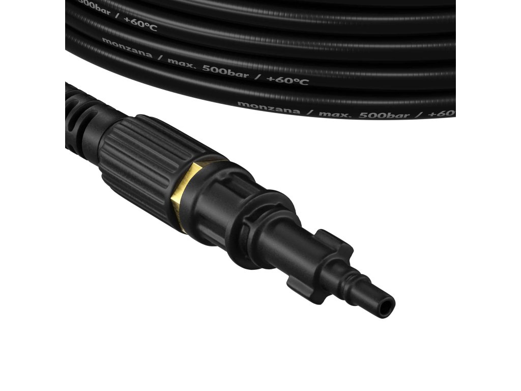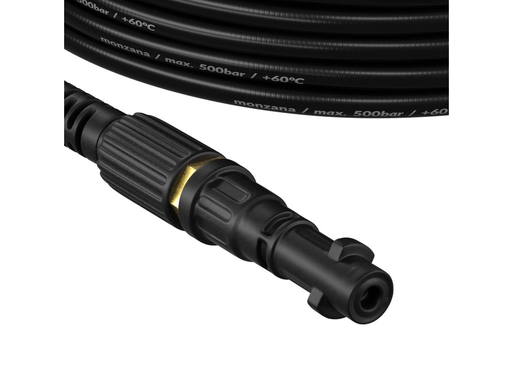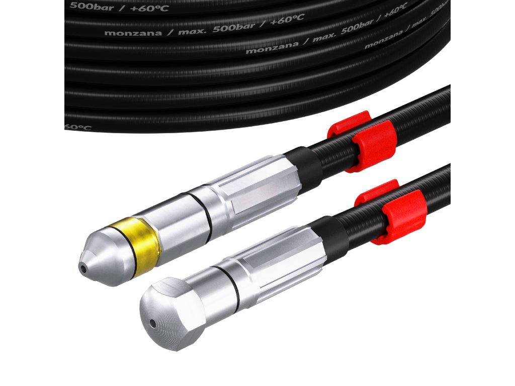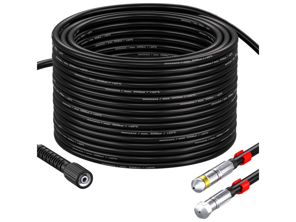 Vysokokvalitná hadica na čistenie rúr spoľahlivo vyčistí upchaté odtoky v kúpeľni, kuchyni a pivniciach. Rýchlo a profesionálne vyčistíte aj špinavé dažďové žľaby a vonkajšie kanalizácie. 5-dielna čistiaca súprava obsahuje kvalitnú 30 metrovú hadicu z PVC, dve prémiové trysky a tri adaptéry s dobre opracovanými mosadznými závitmi, ktoré sú kompatibilné so štandardnými vysokotlakovými čističmi.Hadica je obzvlášť robustná a odolná proti zalomeniu na spoji. Je vyrobená z pevnej vnútornej rúrky z PE, ktorá je po celom obvode vystužená polyesterovým opletom odolným proti roztrhnutiu a nakoniec pokrytá robustným čiernym PVC plášťom. Je navrhnutá pre vysoký pracovný tlak 200 barov a maximálny tlak až 500 barov. Tryska s veľkosťou 0,35 mm a otočná tryska s veľkosťou 0,45 mm odstraňujú aj odolné nečistoty vďaka silným predným a zadným vodným lúčom.Pomocou teflónovej pásky, ktorá je tiež súčasťou súpravy, môžete pri čistení dodatočne utesniť spoje. Hadicu možno úhľadne uložiť so všetkým príslušenstvom do úložnej a prepravnej tašky, vďaka čomu bude vždy po ruke.Výhody produktu: