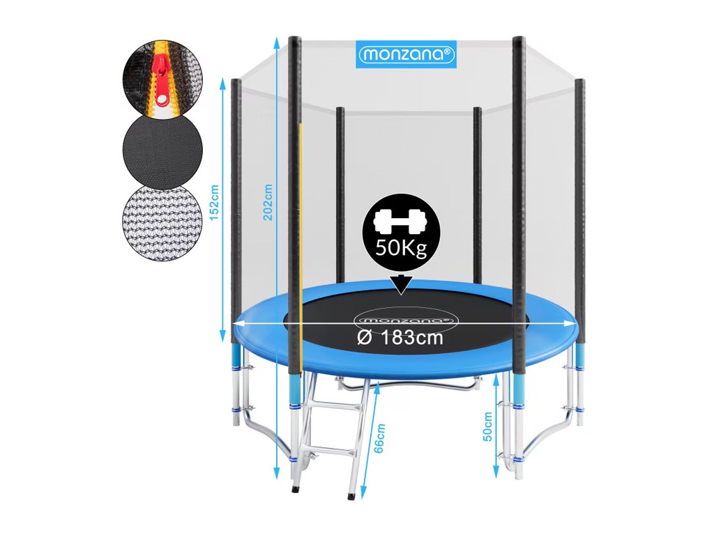 Táto trampolína je špeciálne navrhnutá na vonkajšie použitie a poskytne vašim najmenším radosť z pohybu a skákania v bezpečnom prostredí. Skákaním na trampolíne si deti prirodzene rozvíjajú koordináciu, obratnosť, ovládanie tela aj celkové napätie svalov.Konštrukcia je vybavená zosilnenou bezpečnostnou sieťou a praktickým vstupom so zapínaním. Pevný rám je vyrobený z pozinkovanej ocele, čím zabezpečí jej vysokú odolnosť voči poveternostným podmienkam. Trampolína má maximálnu nosnosť 50 kg. Zvislé tyče sú viackrát upevnené, čím zabezpečujú ešte väčšiu stabilitu celej konštrukcie a zvyšujú bezpečnosť pri používaní. Ochranná sieť je z extra odolného materiálu s vysokou odolnosťou proti roztrhnutiu a má zosilnený vstupný otvor. Mäkký kryt okrajov je pevne pripevnený ku skákacej ploche a je odolný voči UV. Trampolína je vybavená 30 pevnými pozinkovanými oceľovými pružinami a súčasťou balenia je aj praktický napínač pre jednoduchšiu montáž.Upozornenie: Trampolína je určená výhradne na domáce použitie. Nie je vhodná pre deti do 3 rokov. Počas používania musí byť dieťa vždy pod dohľadom dospelej osoby.Výhody produktu: