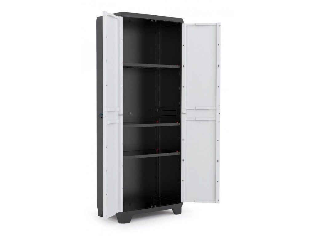 Robustná skrinka je ideálna do garáže, na chatu, terasu alebo do pivnice. Má pevné pánty a možnosť uzamknutia, čím skrinka zaručuje vysokú odolnosť. Má 3 nastaviteľné police ktorá každá ma schopnosť uniesť až 15 kg zaťaženie.
