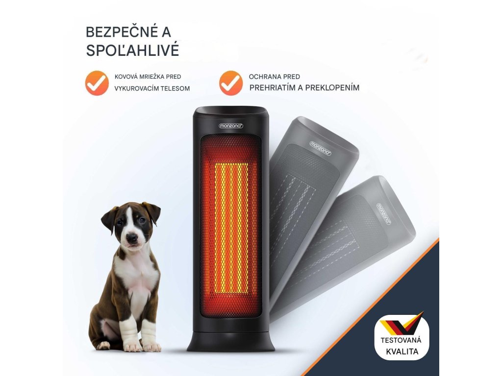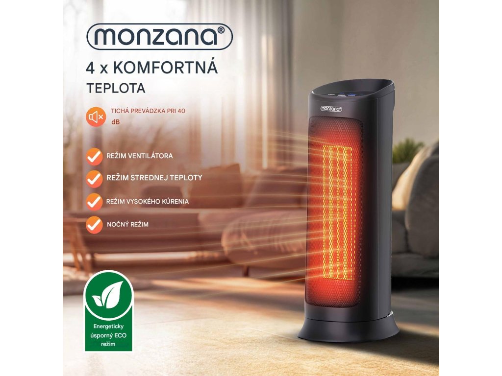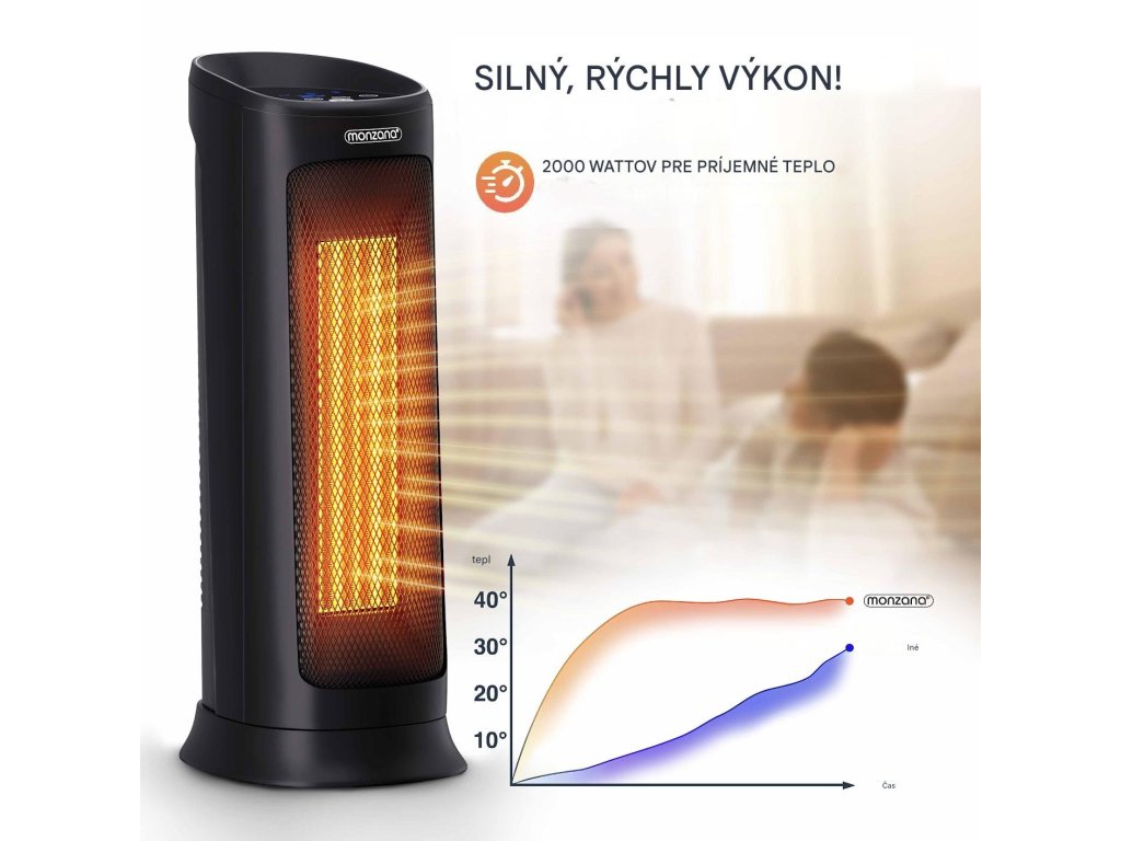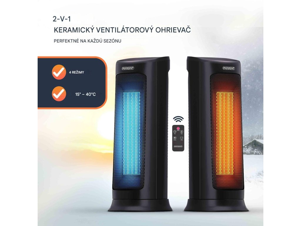 Vďaka silnému výkonu 2 000 wattov sa ohrievač okamžite postará o príjemné teplo. Ventilátor má 4 rôzne režimy - režim ventilátora, stredný ohrev, vysoký ohrev a úsporný režim ECO. Vnútri ohrievača je dvojitý tangenciálny ventilátor, ktorý je tichý a efektívny pri distribúcii vzduchu. Ventilátor má tiež časovač 1-12 hodín a nočný režim. Osciláciu s uhlom 120° možno jednoducho zapnúť alebo vypnúť. Keramický ohrievač ventilátora je možné ovládať pomocou diaľkového ovládača alebo pomocou dotykového displeja, ktorý je umiestnený na hornej strane zariadenia. Robustná kovová mriežka pred výhrevným telesom, ako aj ochrana hrotu a ochrana proti prehriatiu zaisťujú vašu bezpečnosť. Ventilátor možno rýchlo a jednoducho prepravovať pomocou integrovanej rukoväte a kompaktným rozmerom.Výhody produktu: