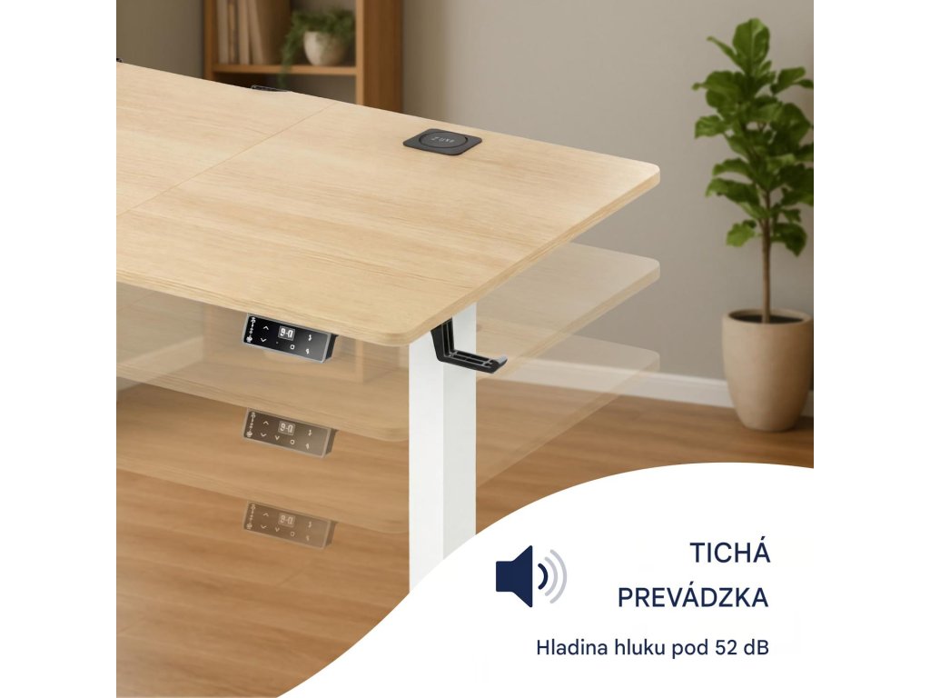 Stôl je vybavený elektrickým motorom, ktorý umožňuje plynulé nastavenie výšky v rozsahu od 72 do 117 cm. Ovládací panel s LCD displejom ponúka možnosť uloženia dvoch výškových pozícií, vďaka čomu je prepínanie medzi prácou v sede a v stoji rýchle a jednoduché. Tichý chod mechanizmu zabezpečuje nerušené používanie v kancelárii aj doma.