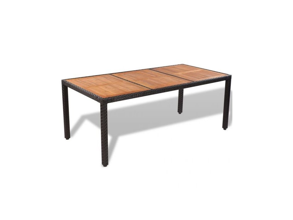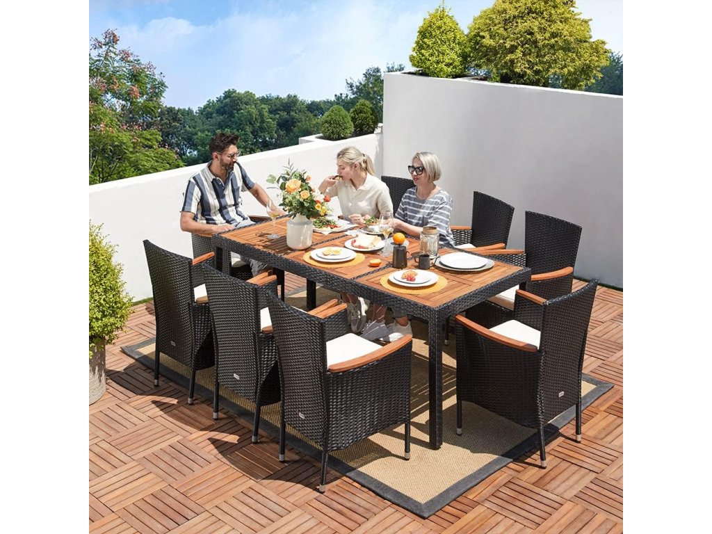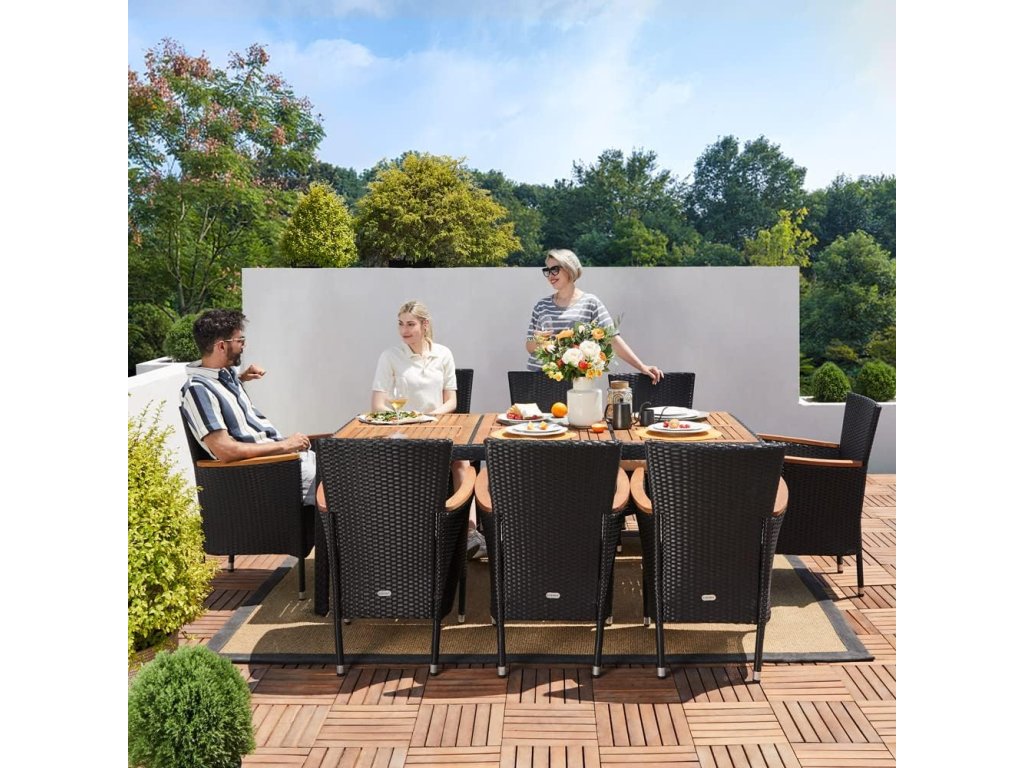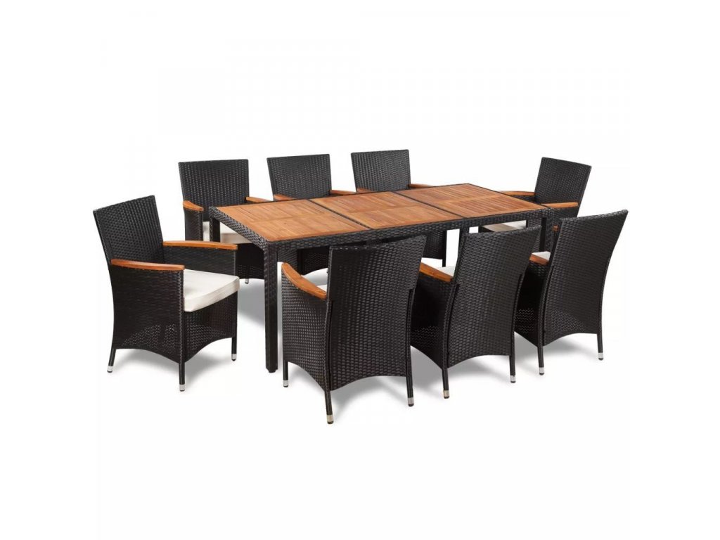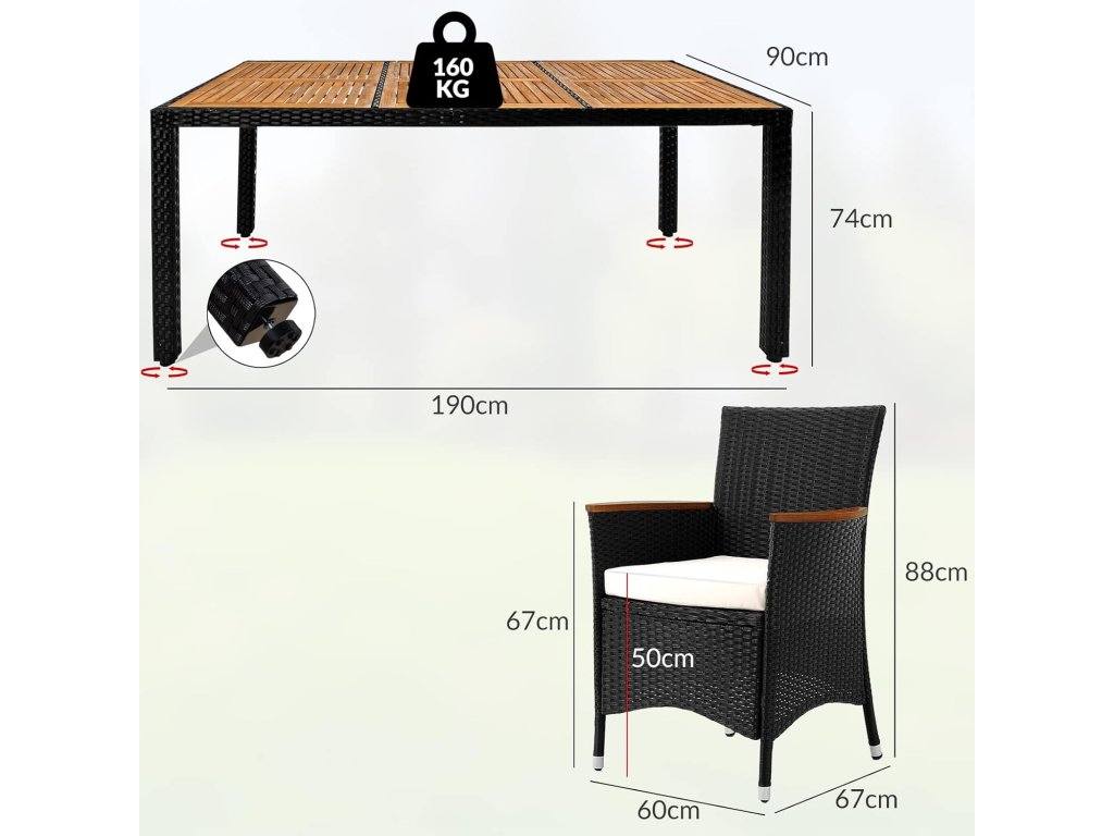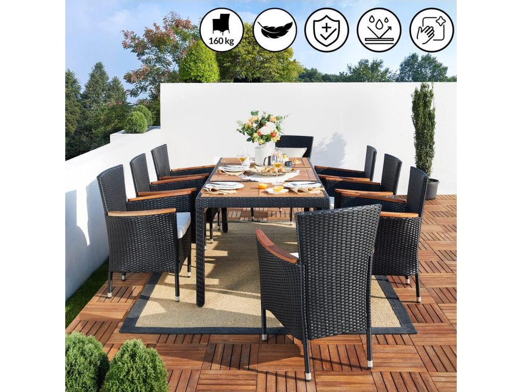 Záhradná zostava z ručne pleteného polyratanu, odolného voči poveternostným podmienkam, obsahuje stôl a osem stohovateľných záhradných kresiel. Stolová doska, ako aj podrúčky sú vyrobené z masívneho agátového dreva a dodávajú záhradnej súprave osobitý šarm. Poťahy na podsedákoch sú vodoodpudivé, takže tekutiny nevsakujú okamžite a dajú sa ľahko utrieť. V prípade potreby je možné poťahy vďaka zipsom jednoducho zložiť a oprať pri 30°C. Nohy stola a kresiel sú vybavené výškovo nastaviteľnými nožičkami, ktoré zabezpečujú stabilitu aj na nerovných povrchoch.