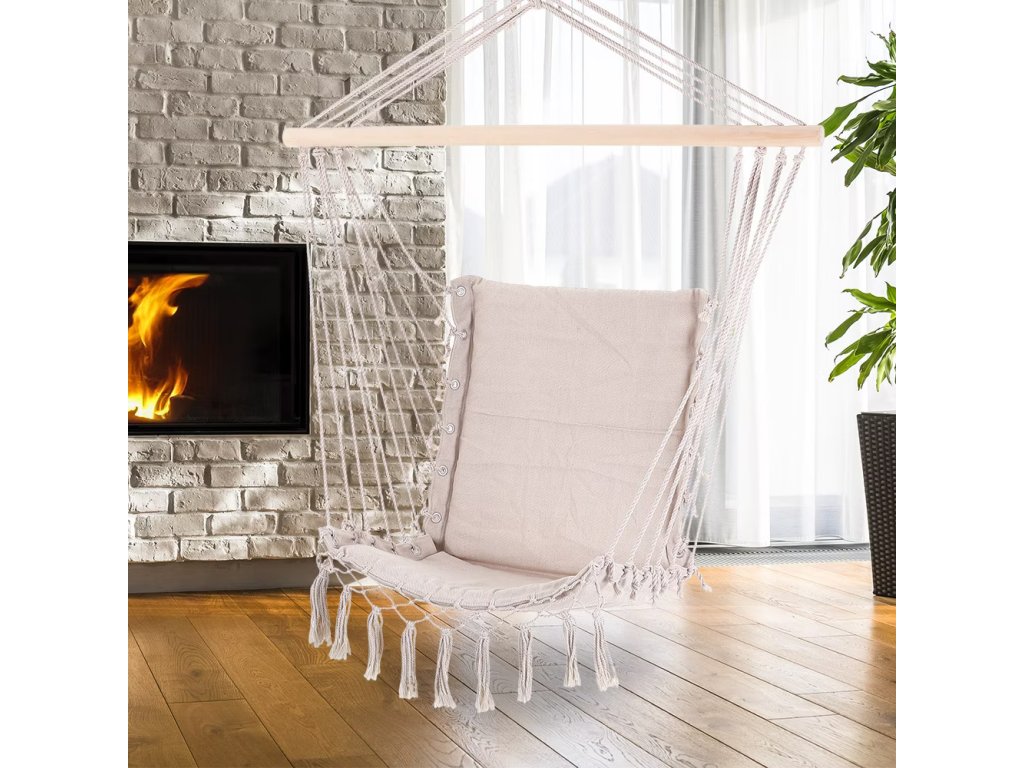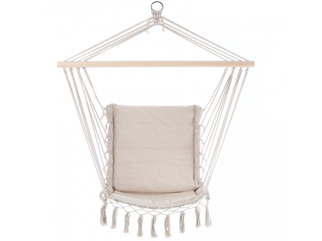 Toto závesné kreslo unesie až 150 kg a jeho jednoduché zavesenie dovoľuje rýchlu manipuláciu hore a dole vďaka precízne navrhnutému odpruženiu – ideálne aj na cesty. Je vhodné na použitie vnútri aj vonku, skvele sa hodí do záhrady alebo na terasu ako pohodlné hojdacie kreslo. Sedák poskytuje výnimočné pohodlie, je zložený z priedušnej bavlnenej polyesterovej zmesi s gramážou 320 g/m². Materiál je plyšový, príjemný na dotyk a zároveň odolný voči poveternostným podmienkam a vode. Laná, ktoré sú odolné voči roztrhnutiu, spájajú závesné kreslo s pevnou drevenou tyčou a robustným oceľovým krúžkom.